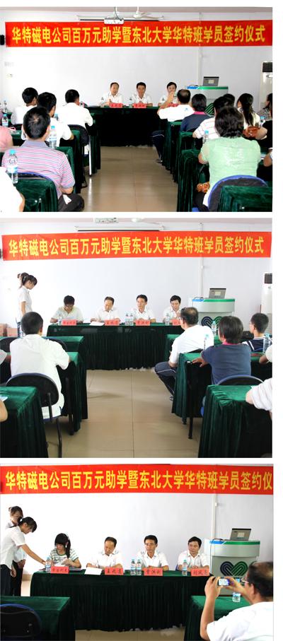 8月22日,華特公司百萬元助學(xué)暨東北大學(xué)華特班學(xué)員簽約儀式在公司電教室舉行。公司董事長兼總經(jīng)理王兆連、技術(shù)中心總經(jīng)理劉風(fēng)亮、總工程師賈洪利、人力資源部經(jīng)理王建功等出席簽約儀式,會(huì)議由技術(shù)中心總經(jīng)理劉風(fēng)亮主持,王兆連董事長作重要講話。王兆連董事長首先對(duì)公司生產(chǎn)、發(fā)展、管理及此次助學(xué)情況、東北大學(xué)悠久歷史以及專業(yè)特色作了詳細(xì)介紹,同時(shí)對(duì)廣大學(xué)員給予厚望,希望以后的學(xué)習(xí)中扎扎實(shí)實(shí),勤奮努力,學(xué)好本領(lǐng),早日成才,隨后與學(xué)員代表簽訂助學(xué)協(xié)議。協(xié)議中就公司雙方各自承擔(dān)的責(zé)任和義務(wù)進(jìn)行了約定。下午,人力資源部就企業(yè)文化、員工禮儀、團(tuán)隊(duì)協(xié)作、行為習(xí)慣的改變等內(nèi)容對(duì)東大華特班學(xué)院進(jìn)行了培訓(xùn)。下發(fā)入學(xué)通知書,各位學(xué)員返回做入學(xué)準(zhǔn)備,9月1日由公司統(tǒng)一組織共同到東北大學(xué)報(bào)到。