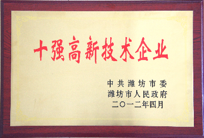 4月28日,在全市科技創(chuàng)新先進(jìn)單位表彰大會(huì)上,公司被授予“2011年度濰坊市十強(qiáng)高新技術(shù)企業(yè)”。