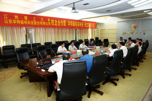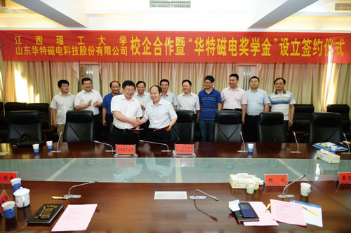 6月30日上午,公司董事長兼總裁、磁電聯(lián)盟理事長王兆連、技術(shù)總工程師賈洪利等一行4人到江西理工大學(xué)洽談校企合作事宜,并簽訂校企戰(zhàn)略合作協(xié)議和捐資華特磁電獎學(xué)基金協(xié)議。江西理工大學(xué)校長羅嗣海、副校長溫和瑞、楊斌以及黨辦校辦、研究生院、學(xué)工部、對外聯(lián)絡(luò)與合作處、科技處、資環(huán)學(xué)院相關(guān)負責(zé)人出席了簽約儀式。簽約儀式由溫和瑞副校長主持。