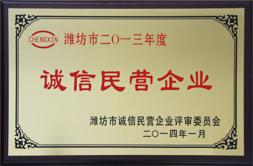 近日,公司被濰坊市誠信民營企業評審委員會授于濰坊市“誠信民營企業”。