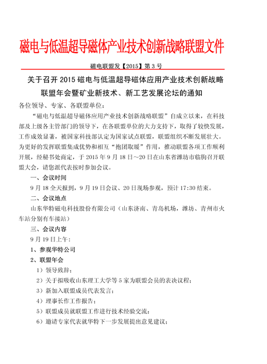 關(guān)于召開(kāi)2015磁電與低溫超導(dǎo)磁體應(yīng)用產(chǎn)業(yè)技術(shù)創(chuàng)新戰(zhàn)略聯(lián)盟年會(huì)暨礦業(yè)新技術(shù)、新工藝發(fā)展論壇的通知