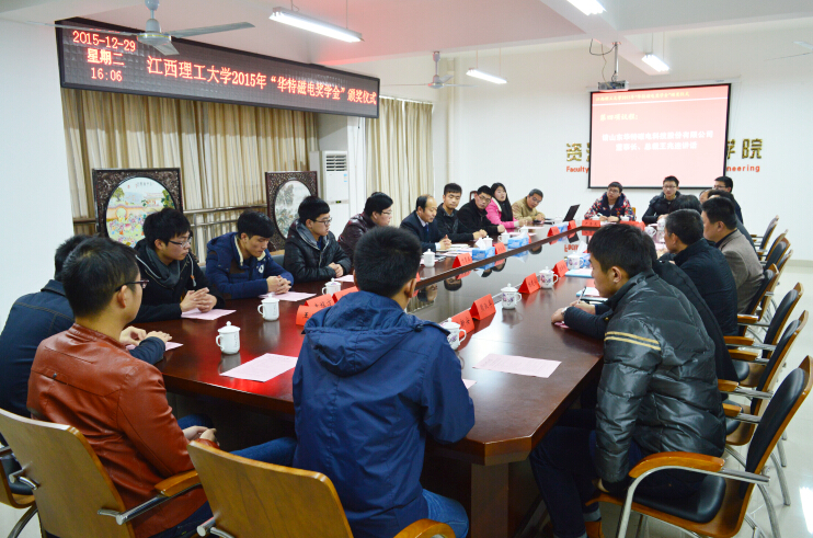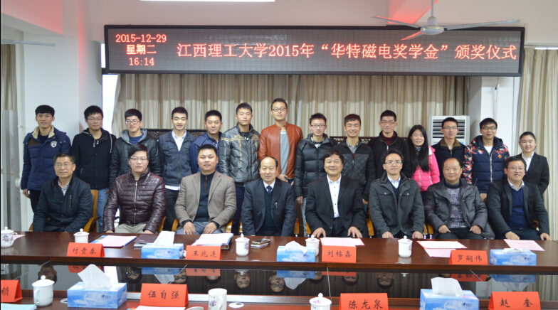 2015年12月29日,江西理工大學2015年度“華特獎學金”的在江西理工大學黃金校區(qū)逸夫?qū)嶒灅堑谝粫h室舉行頒獎儀式,山東華特磁電科技股份有限公司董事長王兆連、濰坊新力超導(dǎo)磁電科技有限公司選礦實驗室主任付貴泰應(yīng)邀出席,江西理工大學副校長伍自強教授、校團委書記、學工部副部長汪鋒鎖、研究生院院長助理陳龍泉、資環(huán)學院黨委書記楊建永、院長趙奎、院黨委副書記熊淑華、2015年度“華特磁電獎學金”的全體獲獎同學參加了本次儀式。
