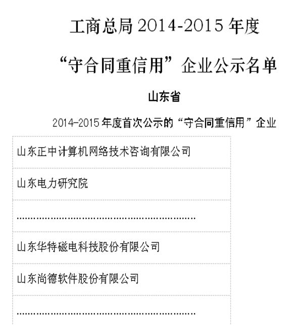 山東華特列入工商總局2014-2015年度“守合同重信用”企業