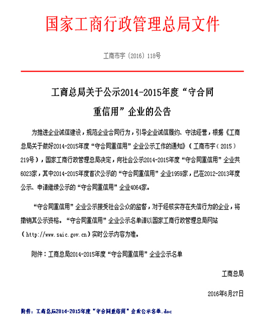 近日國家工商行政管理總局以工商市字(2016)118號發布了工商總局關于公司2014-2015年度“守合同重信用”企業的公告,華特公司名列其中。近年來華特公司積極推進誠信建設,嚴格規范合同行為,誠信履約、守法經營,得到了上級主管部門和客戶的一致好評,一直是山東省“守合同重信用”企業,本次列入國家級“守合同重信用”企業是對公司規范化管理的肯定,將進一步推動企業的快速發展,促進企業向國際領先的磁力應用系統服務商邁進。