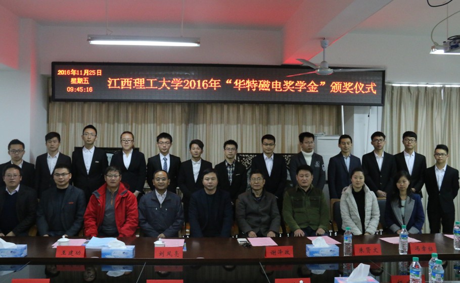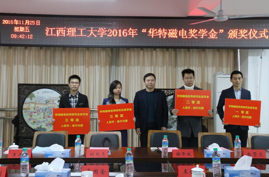 11月25日上午,2016年度“華特磁電獎(jiǎng)學(xué)金”頒獎(jiǎng)儀式在江西理工大學(xué)會(huì)議室隆重舉行。華特磁電公司常務(wù)副總裁劉風(fēng)亮、綜合管理部經(jīng)理王建功,江西理工大學(xué)副校長(zhǎng)李國(guó)金、學(xué)生工作部副部長(zhǎng)劉志剛等領(lǐng)導(dǎo)出席頒獎(jiǎng)儀式。