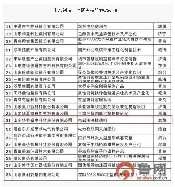 2019年5月23日上午,以“科技鑄就品牌之魂 創(chuàng)新推動高端發(fā)展”為主題的制造業(yè)高質量發(fā)展2019山東論壇暨山東制造?硬科技TOP50品牌榜發(fā)布儀式在濟南市南郊賓館舉行。華特公司“電磁淘洗精選機”產品成功入圍“2019山東制造?硬科技Top50品牌榜”,公司常務副總劉風亮出席會議并領取獎杯。