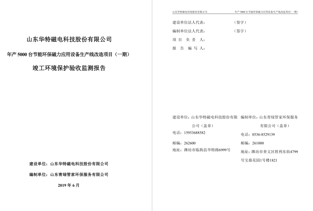 山東華特磁電科技股份有限公司年產5000 臺節能環保磁力應用設備生產線改造 項目(一期)竣工環境保護驗收監測報告