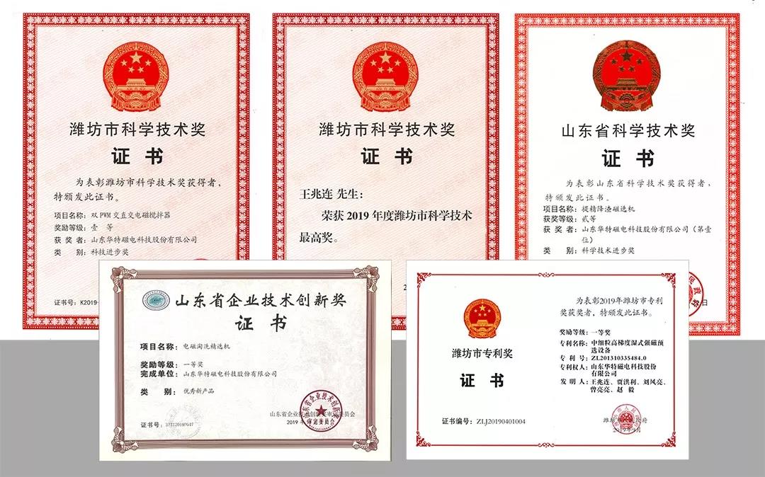 這一年,我們大力實施創新驅動發展戰略,激發企業創新活力,技術研發能力、創新成果穩居行業龍頭。與馬鞍山礦院專家聯合研發的提精降渣磁選機,采用全磁選工藝替代反浮選工藝,縮短選礦工藝流程,實現了批量化生產,獲山東省科技進步二等獎;“雙PWM交直交電磁攪拌器”榮獲山東省第四屆智能制造創新創業大賽一等獎、第三屆山東省科技工作者創新大賽一等獎,濰坊市科技進步一等獎;“電磁淘洗精選機”榮獲山東省優秀新產品一等獎、入圍“2019山東制造?硬科技TOP50品牌榜”,榮獲中國冶金礦山科學技術獎一等獎;“中細粒高梯度濕式強磁預選設備”榮獲濰坊市專利一等獎。